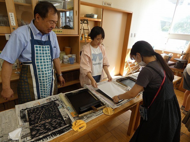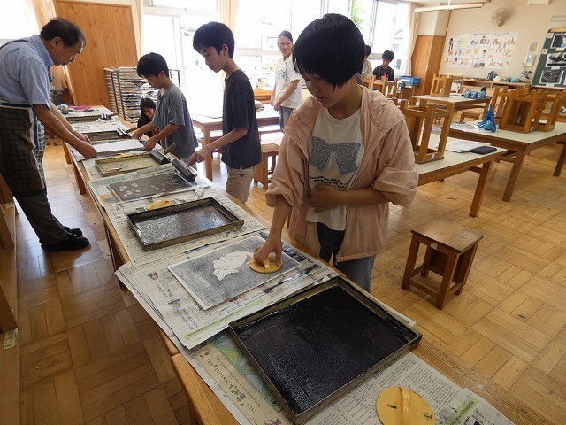 版画の板にインクを付けてばれんで擦り、仕上がり具合を確認する。