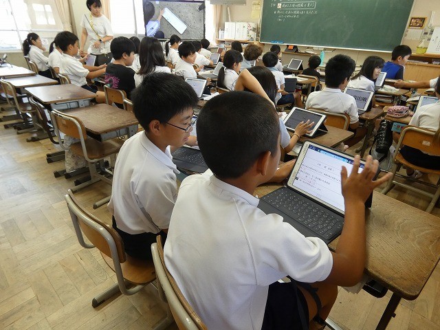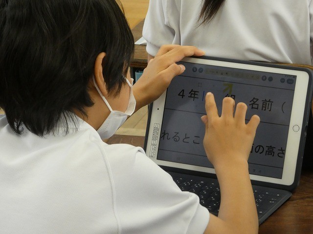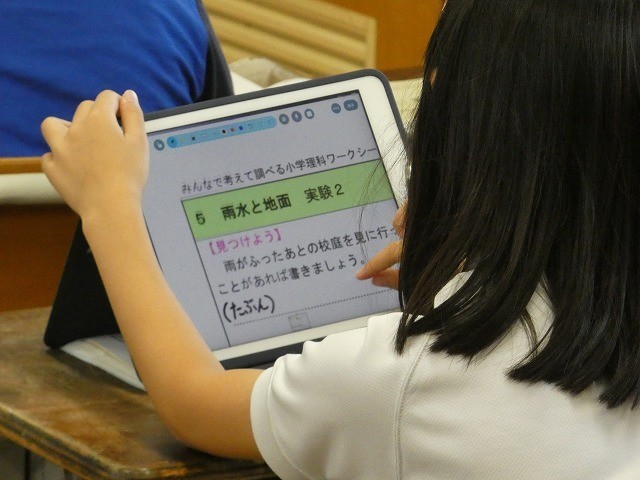 雨が降った後の校庭を見て、気付いたことをデジタルワークシートに書いていました。