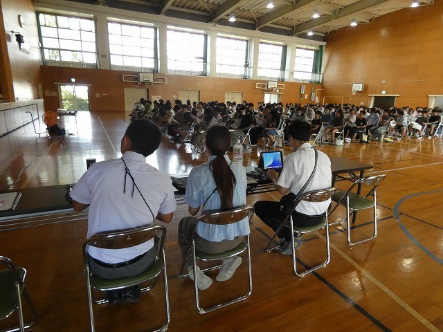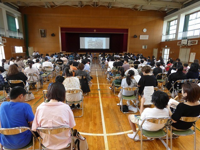 修学旅行の目的と概要、出発・帰着の場所と時刻、持ち物、提出物、食事など、資料を基にして各学級の担任が説明しました。