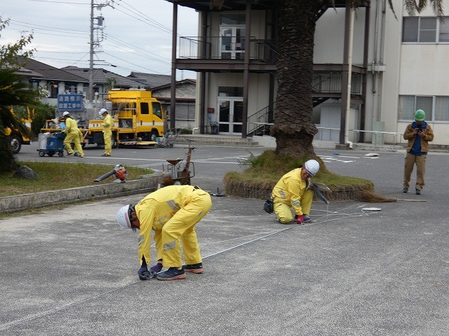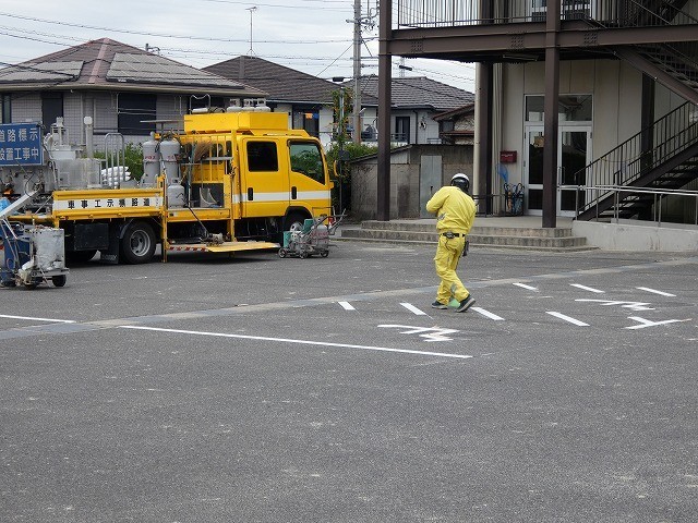 現在、正門を入ってすぐにある駐車場の白線引き作業をしています。