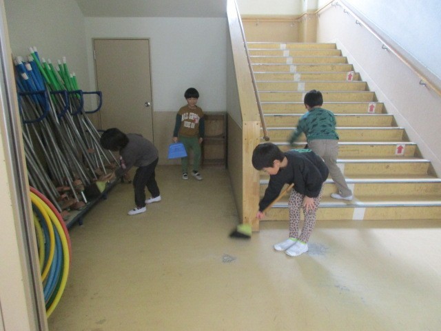 枯れ葉や砂が昇降口に入り込み、掃除の時間には、それを子どもたちがきれいにしていました。