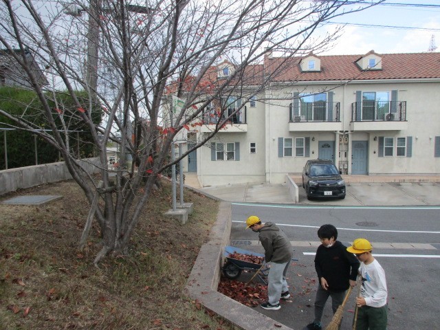 校庭の葉も落ち葉となり、それを集め、一輪車で運んでいました。
