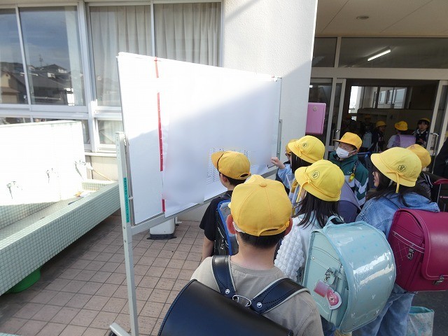子どもたちは登校後に、各学年の昇降口に掲示してある新しい学級名簿を見て、自分が何組になったかを確認しました。