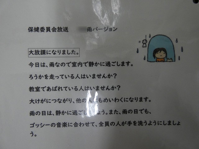 大放課に、保健委員会の児童が全校放送で、雨の日の過ごし方について放送しました。