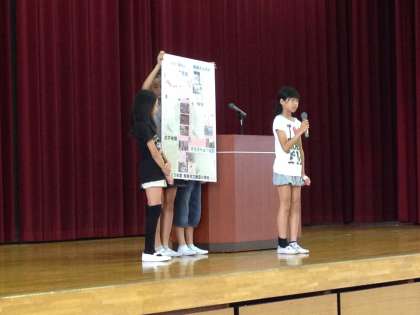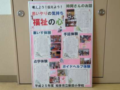 朝会の中で、5年生が先日行った「福祉体験活動」をまとめたパネルの紹介がありました。このパネルは、10月26日(土)・27日(日)に行われる「第16回知多市福祉フェスティバル」で展示されます。場所は、知多市民体育館ロビーです。お時間がありましたら、ぜひ、ご覧ください。