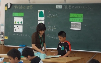 「混色でぬりましょう」をめあてに、「物語の世界」を表現しています。