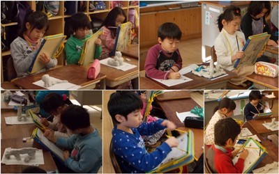 友達の作った作品を見る前に、自分の作品の工夫した所をプリントに記入しました。友だちの作品のよい所がたくさん見つかりそうですね。