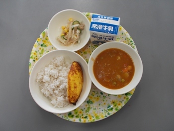 ハヤシライス、オムレツ、大根サラダ、牛乳