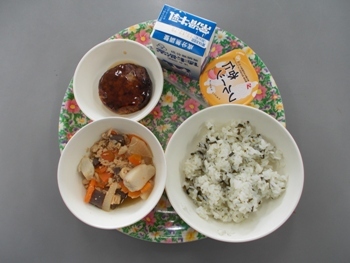 ワカメごはん、里芋と野菜の煮物、杏仁デザート