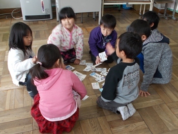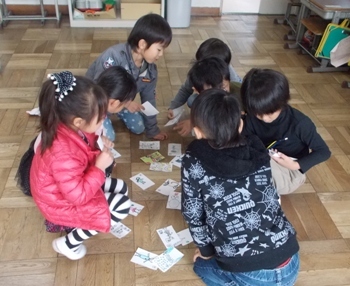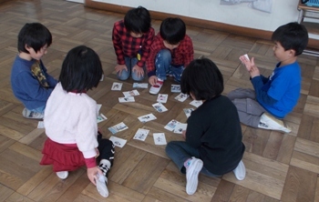 自分たちで作った冬の言葉を使ったカルタを使って、グループでカルタ取りをしました。楽しくできましたね。