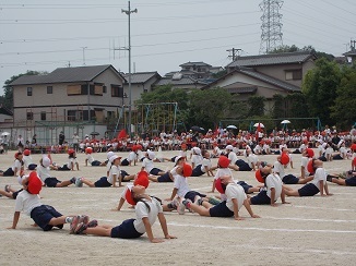 学年種目のデカパンリレーの前には,ミニ組み体操をしました。一人わざから五人わざまで,かっこよく演技ができました。今までの練習の成果を発揮できたかな?