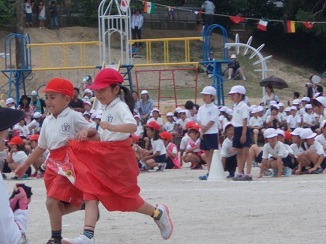 デカパンリレーでは,2人の息を合わせてがんばりました。妖怪パンツをはいて,音楽のリズムにのって楽しくリレーができました。