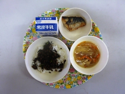 暑い日になりました。本日の献立は、ご飯、牛乳、肉ひじきご飯の具、けんちん汁、さばの塩やきです。けんちん汁は、ごぼう、にんじん、だいこん、あぶらあげ、鶏肉、豆腐が入り、とても具だくさんです。おいしく食べられましたか。