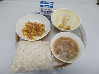 9月13日(火)の給食は,ソフトめん,とりなんばんじる,だいずとじゃがいものあまから,なし,でした。今日は,雨が降ったりやんだりですっきりしない天気でした。南の海上に発生した台風16号の動きが心配ですね。