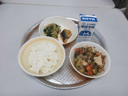 ご飯、すき焼き風煮、鯖の塩焼き、野菜の胡麻和え、牛乳
