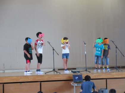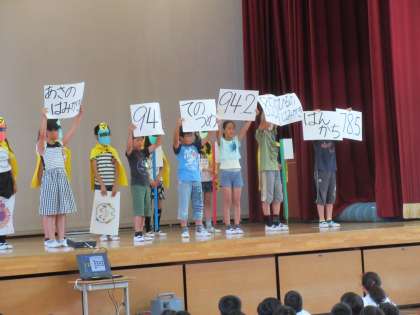 今日の児童集会は,保健委員会から私達の健康戦隊マモルンジャーが「爪切り」「ハンカチ」「歯みがき」の呼びかけをしました。続いて生活委員会からは,やじるしマンが登場し,廊下や階段での衝突事故の防止のため,マナーを守って生活しようと呼びかけをしました。総務委員会からは,あいさつの輪を広めようと「あいさつビンゴ」の紹介がありました。