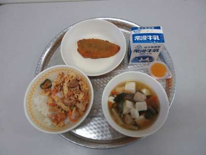 ご飯、ちらし寿司の具、鶏団子汁、あじの梅しそフライ、一口みかんゼリー、牛乳