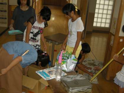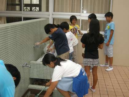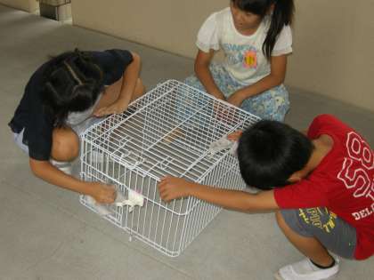 飼育委員会の活動の様子です。うさぎのショコラのゲージをきれいにしています。