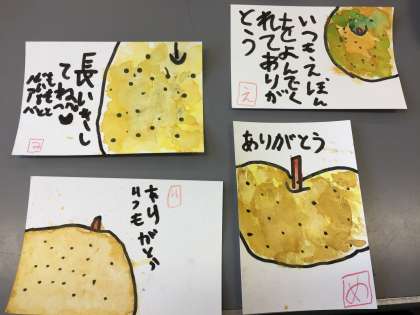 生活科では,敬老の日に合わせて絵手紙をかきました。「ありがとう」「長生きしてね」など温かい気持ちが感じられる時間になりました。