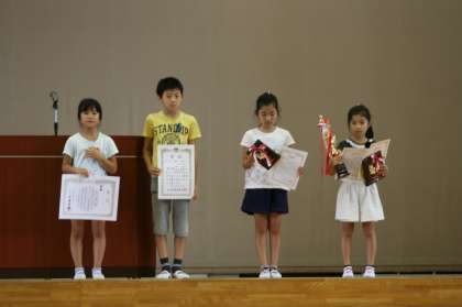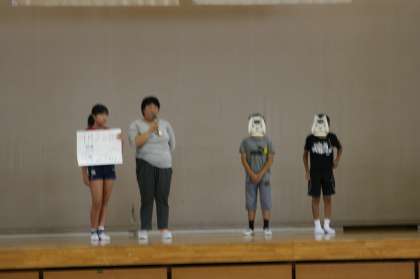 朝会では,校長先生から陸上100m走で9.98の記録を出した桐生選手にまつわるお話を聞きました。その後,表彰,飼育委員会の児童による発表,今週2年生に体験活動として入る大学生の紹介がありました。少し涼しくなり,しっかりと最後までお話しに集中することができた朝会でした。