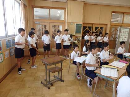 5年生では,福祉活動の一環として,福祉施設「QOL」を訪問したり,民生児童委員さん主催の「高齢者の集い」に参加したりします。その折に,合唱や器楽合奏を行います。写真はリコーダー演奏を予定している学級の練習の様子です。お年寄りの方々に喜んでいただけるよう練習しています。