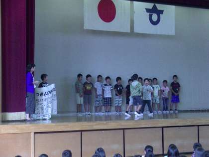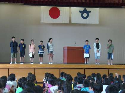本日は、先週行われた児童会役員選挙で決まった後期児童会役員の任命と引き継ぎが行われました。そして、相撲大会とピアノコンクールの表彰、4年生からあいさつ達人になるための呼びかけ活動が発表されました。
