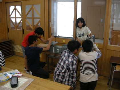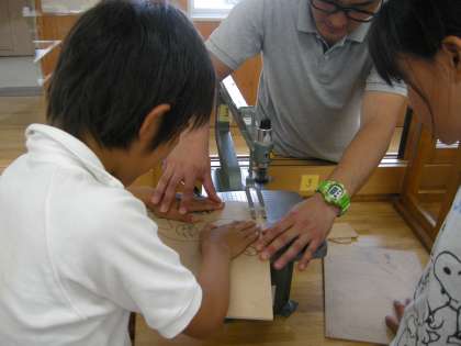 5年生の図工の時間です。木の板を加工して,「伝言板」を製作します。電動糸のこの使い方も学習します。