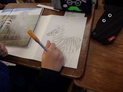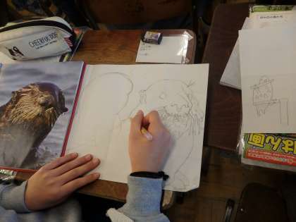6年生の図工の時間です。生き物(架空のものも含む)をテーマに版画に取り組みます。まず下絵を作成します。