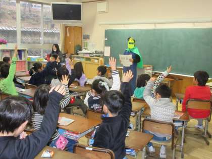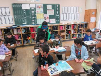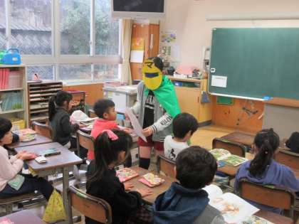 隔週の水曜日の恒例、マモルンジャーに扮した保健委員のお兄さん、お姉さんが給食後、低学年の教室に手の爪・ハンカチ・歯みがき調べに来てくれました。活動もすっかり定着してきています。