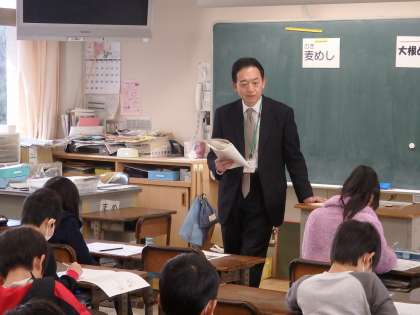 歴史民俗博物館の館長さんに「昔のくらしと新田地区の歴史」をテーマに出前授業をしていただきました。