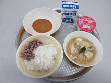 ご飯、梅ちりご飯の具、豆腐と湯葉のすまし汁、コロッケ、ヨーグルト、牛乳