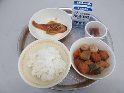 ご飯、味噌おでん、鮭の茸のあんかけ、納豆、牛乳