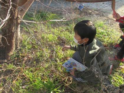 外に出てからは、桜の芽の中身を観察し、生き物探しが始まりました。