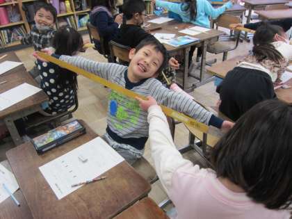 30cmものさしで測ることができない長さがでてきました。1mものさしを見せると「おぉ!長い!」と驚きの声が上がり,1mものさしを使って腕の長さを測りました。