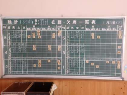本日の児童の欠席状況ですが,3年2組,4年3組は本日から3日間の学級閉鎖です。インフルエンザにより欠席している児童が学級閉鎖をしている学級以外で,全校で15名おり,わずかずつですが増えています。インフルエンザ感染拡大防止のため,手洗い・うがい・換気・適度な湿度に心がけていただきますようお願いします。なお,発熱・頭痛・関節の痛みなど,インフルエンザの兆候が見られましたら,すぐに医療機関に診察していただきますようお願いします。
