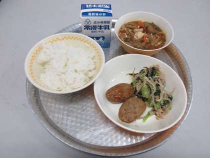 ご飯、夏野菜の味噌汁、胡麻つくね、小松菜ともやしの和え物、牛乳