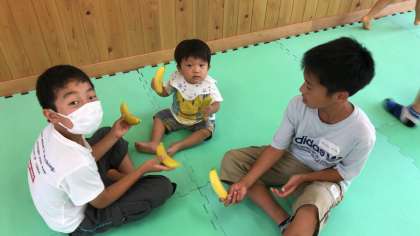 赤ちゃんふれあい体験の様子です。「布あそび」やバナナのおもちゃを使った遊びなどを行いました。