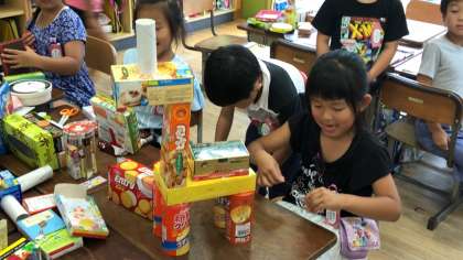 1年生の図工の時間です。はこをつんだり,つないだりしていろいろな形をつくります。