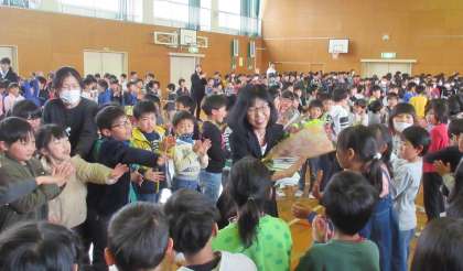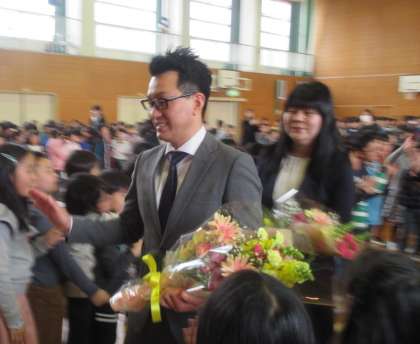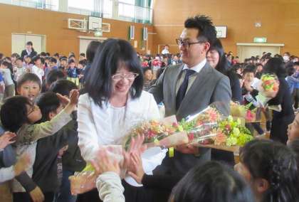 写真は離任する先生たちが子どもたちの中を退場する様子です。