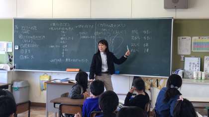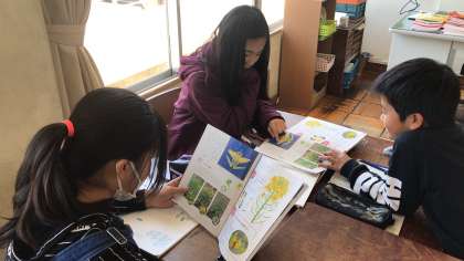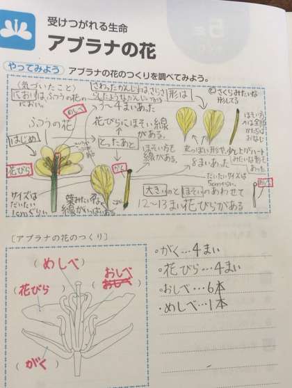 5年生の理科の時間です。アブラナの花のつくりを確認します。