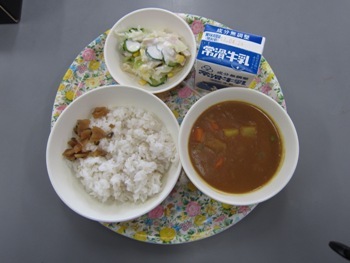 今日から1年生も給食が始まりました。みんなの大好きなカレーライス。しっかり食べることができましたね。