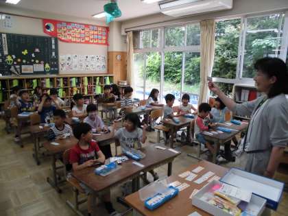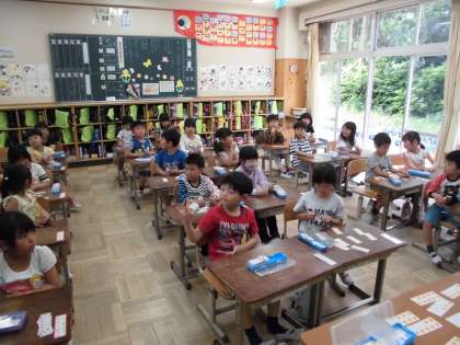 1年生の算数の時間です。数図ブロックのカードを使って,数の大きさ比べのゲームをします。