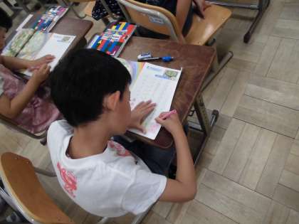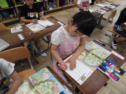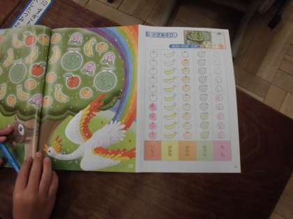 1年生の算数の時間です。教科書のどの果物がどれだけ多いかを考えます。