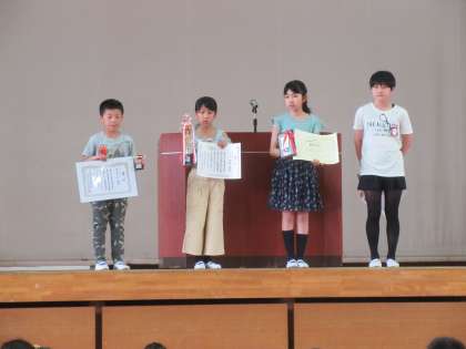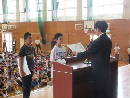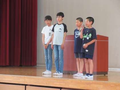 今日の朝会は、ペアの児童と一緒に入場しました。卓球、ピアノ、空手の表彰の紹介のあと、校長先生から優良児童の表彰がありました。その後、次の日曜日に予定されている知多市小中陸上大会の壮行会が行われ、各種目の代表が力強く抱負を語ってくれました。最後に6月に行われる運動会の応援場所を決めるくじ引きが行われました。