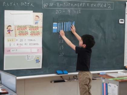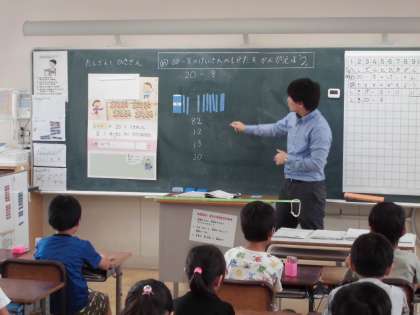 2年生の算数の時間です。数え棒を使って,ひき算に取り組みます。
