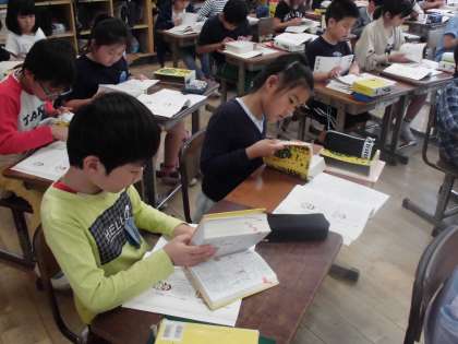 4年生の国語の時間です。漢字辞典の使い方を学び,実際に漢字を調べます。