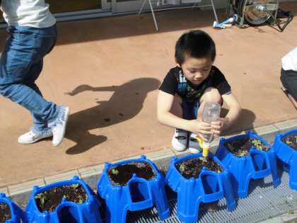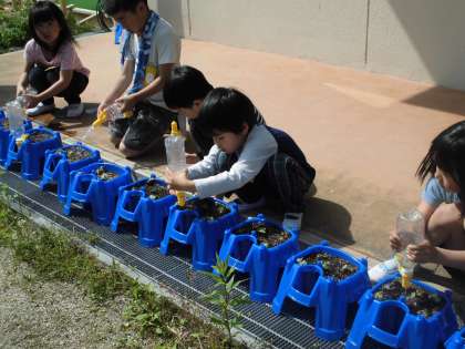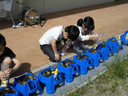 1年生の生活科で種をまいたアサガオの水やりの様子です。大きく育つといいですね。