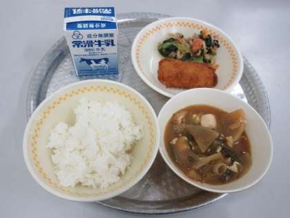 ご飯、ささみ梅しそフライ、小松菜と鰹の和え物、新タマネギの味噌汁、牛乳