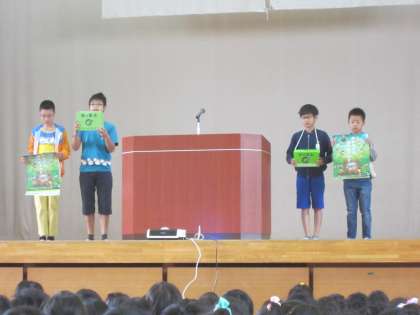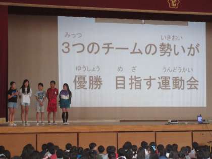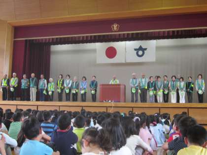 朝会では,小中陸上大会などの表彰の後,わんわんパトロールの皆さんの紹介がありました。いつも登下校に子どもたちの見守りをありがとうございます。その後,緑化委員会から緑の羽根募金,体育委員会から運動会のスローガンについての話がありました。