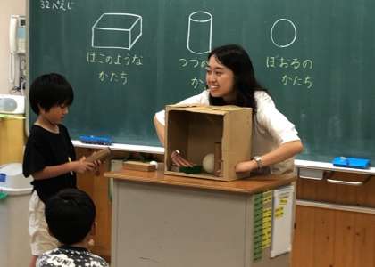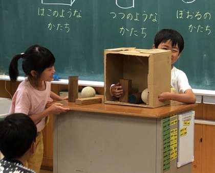 1年生の算数の時間です。直方体や球,円柱などの立体を見て,手ざわりだけで同じ立体を見つけます。